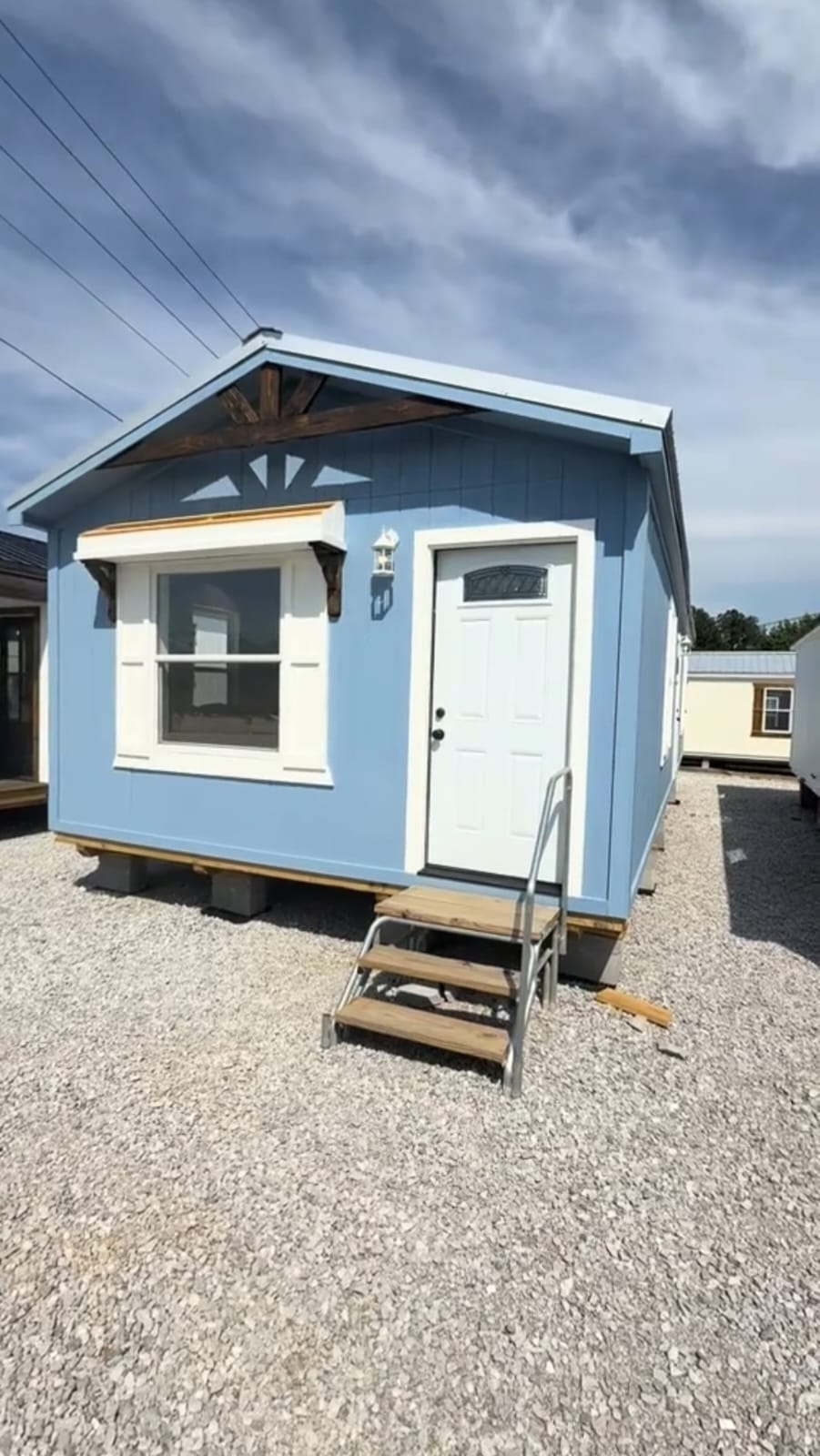 ● Exterior: Light blue siding with white trim, a small window awning, and decorative wooden accents in the front gable.